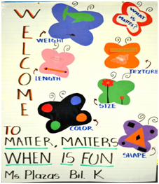 Se realizó un proyecto para la clase de Ciencias de los estudiantes de kinder de la Escuela Hearn Elementary School (ALIEF ISD-Houston TX). Se obtuvo una beca para comprar un kit sobre Materia y Energia y se realizó una mini-feria de la ciencia, en la cual estudiantes de varios grados, aprendieron conceptos sobre los cambios de la materia y la energía. A lo largo de la feria se también se aprendieron conceptos y términos importantes que pueden ser usados por los estudiantes, para entender estos cambios en su relación como individuos con el Medio Ambiente.